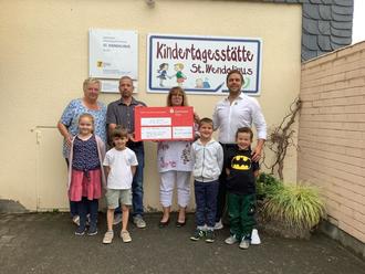 Freude über die Spende v.li. Andrea Paulus (stv.Leiterin KiTa St. Wendalinus), Bernd Nellinger (Vors. FöVerein KiTa/Grundschule),Petra Scharlott-Troll (StO Leitung der KiTa) und Pascal Hoff (2. Vors. SC Beuren)