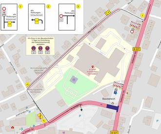 Wenn ab 16. September der Busverkehr über den Ersatzbusbahnhof am Neuen Markt läuft, kann mit den Baumaßnahmen vor Ort begonnen werden. Als letzte vorbereitende Tätigkeit ist jedoch der Rückbau der Verkehrsinsel an der Ecke Koblenzer-/St. Josefstraße erforderlich. Das wird wie bei der Verkehrsinsel an der Evangelischen Kirche zwei Tage in Anspruch nehmen. Um während dieser Baumaßnahme die Zufahrt zum NORMA Markt sicherzustellen, werden die Kunden von der Koblenzer Straße über die Alte Kirchstraße und Josef Krebsstraße umgeleitet. Sie dürfen dann ausnahmsweise das kurze Stück bis zur Einfahrt zum Parkplatz entgegen der Fahrtrichtung fahren. Sind Abbau der Verkehrsinsel und Straßenmarkierung erfolgt, greift sofort die Übergangslösung für die Bauzeit am Donatusplatz. Die sieht neben den schon geschilderten weitläufigen Maßnahmen für das kurze Stück bis zur Baustelle die Zu- und Abfahrt zum Markt mit Gegenverkehr vor. Die Einfahrt von der Koblenzer Straße kann dabei aus beiden Richtungen erfolgen, das Abfließen wegen der Einbahnregelung nur nach links stadtauswärts. Die Nutzung der Tiefgarage am Donatusplatz ist dann nicht mehr möglich.