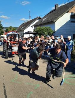 Außerdem haben insgesamt 11 Mannschaften, davon drei Frauenmannschaften ihre Kraft beim Traktorziehen gezeigt. Die „Flammentöter“ haben mit dem 6. Platz eine gute Platzierung im Mittelfeld errungen. Das Traktorziehen haben die „Vier lustigen Drei“ Christian Schirmer, Svend Feuerbach, Andreas Merten und Ralf Butterbach gewonnen. Sie haben die rund 50 m lange Strecke in 20 Sekunden bewältigt. Auf dem 2. Platz landete der FC Neuhütten-Züsch-Damflos mit 21 Sekunden. Und den dritten Platz belegte Dirty Eleven mit 25 Sekunden. Die beste Damenmannschaft waren die „Chronisch Kranken“ mit einer Zeit von 57 Sekunden. Alfons Grünenwald hatte für die Gaudi seinen Massey Ferguson Oldtimer Schlepper zur