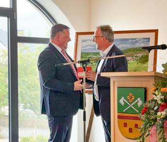Landrat Stefan Metzdorf (rechts) überbrachte seine Glückwünsche und überreichte Ortsbürgermeister Uli Frohn eine kleine Aufmerksamkeit zum Jubiläum.
