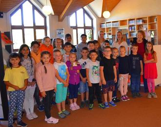 Die Kinder des LiF-Kurses zusammen mit ihren Lehrkräften in der Bibliothek des Gymnasiums Hermeskeil.