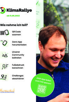 Um teilzunehmen, einfach die kostenlose "2zero"-App herunterladen, die KlimaRallye Community Verbandsgemeinde Hermeskeil auswählen und persönlichen CO₂-Fußabdruck berechnen. Schon kann man beginnen passende Challenges für die persönliche KlimaRallye auszuwählen, um den eigenen CO₂-Fußabdruck durch das Sammeln von Challenge-Punkten zu verringern. Bei Fragen können Sie sich gerne an den Klimaschutzmanager der Verbandsgemeinde Hermeskeil wenden: Tel.:06503 809-164 oder E-Mail: a.thomas@hermeskeil.de