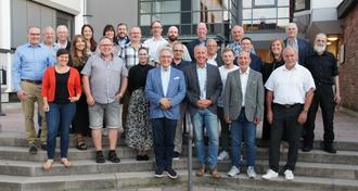 Der neue Stadtbürgermeister und der neue Stadtrat stellen sich zusammen mit dem neuen Verbandsbürgermeister Stefan Ding (li) und dem bisherigen geschäftsführenden Bürgermeister Theo Palm (o. re) den Fotografen