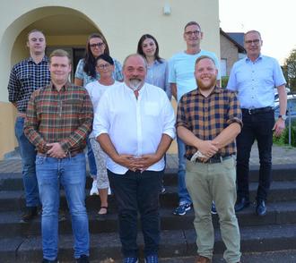 Der neugewählte Gemeinderat von Grimburg mit Bürgermeister Armand Seil (Mitte), eingerahmt von seinen Beigeordneten Tobias Schömer (li.) und Benedikt Peez (re.) sowie VG-Bürgermeister Stefan Ding.