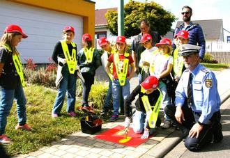 In einer konzertierten Aktion setzten Grundschule, Gemeinde und Polizei am vergangenen Freitag die Idee um, den Weg der Kinder zur Schule bzw. Kindertagesstätte im Ort sicherer zu gestalten. Gleichzeitig sollen Eltern und Kinder, so der Wunsch von Schulleitung und Polizei, dazu animiert werden zu Fuß zu gehen und das Auto stehen zu lassen.