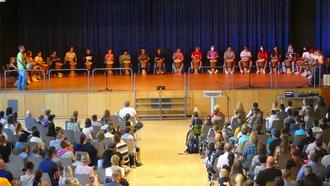Die genannten 6. Klassen waren es im Anschluss auch, die mit einem vielfältigen Programm die neuen Fünftklässler begrüßten. Es wurde getrommelt, es wurden Gedichte vorgetragen, ein schönes Lied wurde ebenso gesungen, begleitet mit Gitarre und von 26 Becherklopfern. Allen Beiträgen war gemeinsam, dass sie die Sorge vor dem, was nun auf die Neuen zukommt, wegfegten und einen schönen Start im neuen Schulhaus ermöglichten.