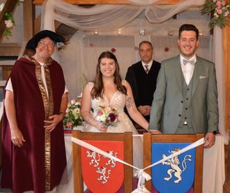 Das Ehepaar Luisa und Fabian Kaufmann, mit dem Standesbeamten Wolfgang Nellinger (Mitte) und Michael Hülpes dem Vorsitzenden des Fördervereins Burg Grimburg nach der Trauung.
