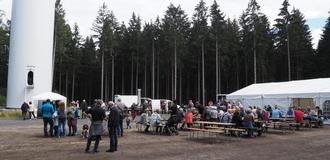Als besondere Gäste waren Verbandsbürgermeister Stefan Ding mit Gattin und Ortsbürgermeister Siegfried Joram anwesend. Auch der frühere Ortsbürgermeister Josef Barthen, in dessen Amtszeit der Windpark initiiert worden war, weilte unter den Gästen. Zahlreiche Besucher hatten es sich bei gutem Wetter nicht nehmen lassen, der Einladung zu folgen. Mittels einer Videovorführung konnte die Bauphase verfolgt werden, die Kinder hatten in einer Hüpfburg ihren Spaß. Geschäftsführer Deimling begrüßte die Gäste und bedankte sich bei den Gusenburgern für die viele Geduld, die während der Bauphase aufgebracht worden war. Ortsbürgermeister Siegfried Joram ließ in seiner Ansprache noch einmal den Werdegang des Windparks Revue passieren und teilte mit, dass mit dem Windpark Gusenburg Nord vier weitere Anlagen geplant seien. Bürgermeister Ding schloss sich mit seinem Grußwort dem Vorredner an. Auch er bedankte sich beim Investor, der in der VG Hermeskeil bei Rascheid weitere Anlagen betreibe.