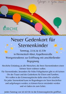 Momentan entsteht auf einer Wand ein Fenster zum Himmel, mit einem Regenbogen und vielen Luftballons. An diese können kleine Sterne geheftet werden, die an ein Sternenkind erinnern, vielleicht mit dem schon ausgesuchten Namen, dem Todesdatum, oder auch nur den Gedanken der Eltern. „Geborgen in Gott“ Dieses Bild wollen wir am Sonntag, 22.September um 15.00 Uhr in der Erinnerungskirche, Kapellenstrasse in Hermeskeil-Abtei mit einem Wortgottesdienst öffnen und laden alle Menschen ein, die sich an Sternenkinder erinnern und ihnen einen kleinen Stern widmen möchten. Egal, ob das Sternenkind schon erwachsen oder jung wäre. Danach ist ein Austausch bei einer Tasse Tee oder Kaffee möglich. Die Erinnerungskirche ist jeden Sonntag von 10-16 Uhr geöffnet.
