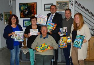 Auf unserem Foto präsentieren im Vordergrund Karl Heil mit (v. li.) Bibliotheksleiterin Marion Adams, Katharina Heil, Günter Weber und Jörg Hartig (Vorstände der Stiftung) sowie Stadtbürgermeisterin Lena Weber einen Teil der gespendeten Spiele.
