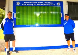 Die Vorstandsmitglieder des Hermeskeiler Sportverein Dirk Faber (li) und Armin Sersch vor der „Patenschaft – Ehrentafel“ im Waldstadion