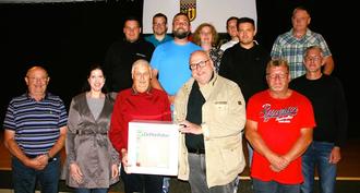 Dr. Berthold Eul, vorne 2. von rechts, übergibt den Defibrillator an den Ortsbürgermeister