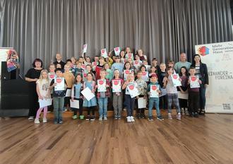 Glückliche Kinder zeigen stolz ihre Lesesommer-Urkunden umrahmt vom Büchereiteam um Marion Adams und dem neuen Stadtchef Christoph König.
