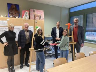Kunst-Lehrerin Ewa Winkel, LRSD Martin Harz von der ADD, Rolf Rauland vom Kreis Trier-Saarburg, die Schülerinnen Laetitia Montes und Anjulie Falkowski sowie Schulleiter Herr Dr. Christian Schmidt bei der Übergabe der neuen Kunst-Räumlichkeiten