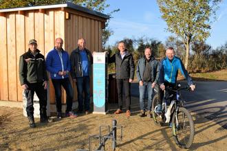 Nahmen gemeinsam die neue Ladestation für Elektrofahrräder in Rascheid offiziell in Betrieb: Frank Lorscheider, Axel Thielen, Andreas Ludwig, Marco Felten, Frank Ludwig sowie Ottmar Seliger (v.l.) (Foto: David Kryszons)