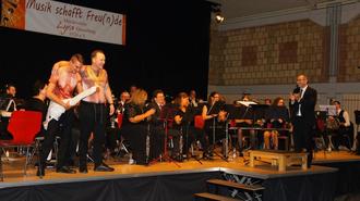 Nach der Pause ging es weiter mit den „Blues-Brothers“ und einem spontanen Einspieler mit bayerischer Blasmusik. Paul Anka, der Justin Biber der 50er Jahre, hat Welthits für alle großen Interpreten, wie z. B. Frank Sinatra, geschrieben. Seine bekanntesten Lieder begeisterten das Publikum. Fred Bockelmann, alias Udo Jürgens, hat hunderte von unsterblichen Songs komponiert und gesungen und damit einen riesigen Erfolg erzielt. „ 17 Jahr, blondes Haar, aber bitte mit Sahne, Merci Cheri, griechischer Wein oder ein ehrenwertes Haus“ um nur einige zu nennen, klangen in einem Medley durch die Halle. Dann ein Höhepunkt des Konzertabends. „The Stripper“ von David Roos wurde schauspielerisch von Markus Brell und Markus Nickels mit einer „Strip-Einlage“ untermalt. Dietmar Knippel hat vor 20 Jahren den Dirigentenstab von Volker Dederichs übernommen. In einer kleinen Laudatio würdigte Thorsten Bronder das Wirken des Orchesterleiters und überreichte ihm ein Geschenk.