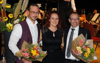 Gruppenbild mit Dame. Jenny Adams, Vorstandsfrau der Gusenburger ehrt die beiden Orchesterchefs, links Moritz Guth und zu ihrer Rechten Dietmar Knippel.