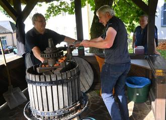 Wenn der Apfelsaft fließen soll muss kräftig gekeltert werden, wie hier am Heimatmuseum.