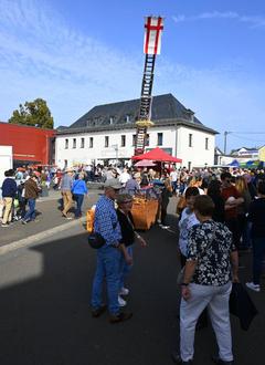 An einer langen Feuerleiter aus dem Feuerwehr-Erlebnismuseum hingen die Stadtfahne und der Erntekranz.
