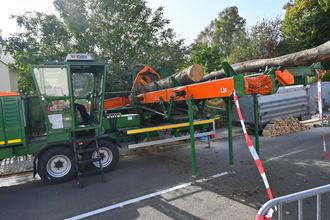 Hier wird Kleinholz gemacht, und das im wahrsten Sinne des Wortes. Die Maschine der Fa. CE-Timber verarbeitet ruck-zuck jeden Baumstamm in handliches Brennholz.