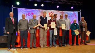 Aus dem Kreis war der Sportkreisvorsitzende Jens Tossing gekommen, der einen Appell an die Politik richtete, Vereine zu unterstützen, damit diese ihrer großen gesellschaftlichen Verantwortung nachkommen könnten. Der Vizepräsident des Handballverbandes Rheinland Winfried Schabio ehrte die Herren-Handballmannschaft des TV Hermeskeil für die errungene Meisterschaft 2023/24 in der Bezirksliga und überreichte deren Kapitän, Lukas Prümm, eine Urkunde. Für seine langjährige Tätigkeit im TV Hermeskeil u.a. als stellvertretender Vorsitzender des Vereins sowie als Abteilungsleiter Handball wurde Dieter Heger mit der Goldenen Ehrennadel des Handballverbandes Rheinland für seine Verdienste um den Handball geehrt. Aus Bitburg war der Präsident des TV Mittelrhein Rudolf Rinnen gekommen, der zusammen mit Sebastian Weinig – stv. Vorsitzender des Turngau Mosel-Saar – Leo Brillowski, Rudi Blasius und Gerd Schumacher für ihre Verdienste um den Turnsport ehrte. Für ihre Mitgliedschaft von 50 Jahren und mehr im TVH wurden etwa 30 Mitglieder geehrt, wovon neun im Saal anwesend waren. Natürlich wurde auch Sport auf der Bühne geboten, Die Leistungsriegen der Mädchen und Jungen von der Turnabteilung führten mit eine tolle Bodenturnshow auf, wobei dynamische Salti und Handstandüberschläge, Flugrollen und Flickflacks das Publikum hellauf begeisterte. Auch das Damen- und Männerballett trainiert von Anna-Lena Schmidt kam nach ihrem dynamischen Tanz nicht um eine Zugabe herum. Der Abend klang aus mit einer tollen Rock- und Pop-Show der Band „Bombshell“, die zum Tanzen und Mitsingen animierte. (Kö)