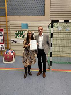 Schulleiterin Heike Meyer nach der Überreichung der Zertifizierungsurkunde durch VG-Bürgermeister Stefan Ding