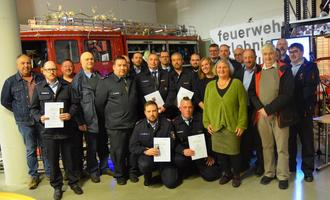 Die Wehrführer der Feuerwehren der Ortsgemeinden mit VG-Bürgermeister Hartmut Heck und den Ortsbürgermeister/innen