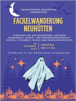 Der Heimatverein Neuhütten veranstaltet am 25. Oktober 2024 wieder seine alljährliche Fackelwanderung. Vor der Wanderung um 17 Uhr wird schon zu einer kleinen Stärkung an der Köhlerhütte in Neuhütten eingeladen. Die geführte Wanderung ist kinderwagengerecht. Im Anschluss darf sich die Wandergruppe über Stockbrot, Kakao und Gruselgeschichten freuen.