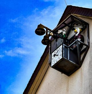 Das Glockenspiel an der Fassade der "Ritterburg". Der Bauhofmitarbeiter versteckt sich hinter der Klappe. Der Bürgermeister gibt mit dem "Hermeskeiler" den Ton an.