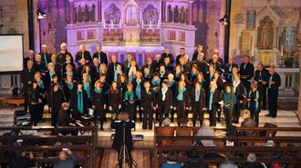 Im letzten Teil des Konzertes füllte sich dann der Altarraum mit den etwa 70 Akteuren des Gemischten Projektchores. Am Beginn standen mit „I will sing with the spirit“ von John Rutter und dem „Alleluia“ von Douglas Brenchley zwei geistliche Lieder. Es folgten der Erfolgstitel der Gruppe Wind „Für Alle“ und der Gospel „In your arms“ von Calvin Bridges und Tore W. Aas mit Christoph Kirsten als Solisten. Das Abendlied „Neigen sich die Stunden“ von Lorenz Maierhofer beendete den offiziellen Teil des Konzertes. Einige Lieder des Frauen- und Projektchores waren in bewährter Manier durch den Pianisten Frank Weilerswist Begleitet worden. Minutenlange stehende Ovationen des begeisterten Publikums forderten natürlich die entsprechende Zugabe. Sie wurde auch gegeben, allerdings nicht ohne Beteiligung der Zuhörer. Mit dem nach Kräften mitgesungenen „Amazing grace“ endete ein Konzert, für das der Leiterin Andrea Stüber und den Akteuren auch aus dem Mund von Fachleuten aus der Musikszene hohe Anerkennung ausgesprochen wurde. Zuhörer und Akteure trafen sich danach noch in der Kulturhalle zu einem fröhlich entspannten „Afterglow“ bei dem noch das eine oder andere Lied gesungen wurde.