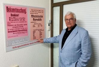 Vor ziemlich genau 100 Jahren – am 22. Oktober 1923 – stürmten in der belgischen und der französischen Besatzungszone frankreichfreundliche Separatisten die Verwaltungszentralen. Auch in Hermeskeil waren es rund 30 teils bewaffnete Männer, die das Rathaus in Besitz nahmen und die „Rheinische Republik“ ausriefen. RuH rekapitulierte diese Aktion im Rahmen einer Serie „Vor 100 Jahren“ in der Ausgabe Nr. 8/2023*. Nun hat der Kulturgeschichtliche Verein Hochwald kürzlich eine Ausstellung im Rathaus eröffnet, die auf Replikationen von originalen Dokumenten und Bildern diese Zeit sehr anschaulich dokumentiert. Vorsitzender Dittmar Lauer (Foto) erläuterte in seiner Einführung auch die Vorgeschichte und die Hintergründe dafür, wie es in der schweren Zeit nach dem Weltkrieg zu dieser Situation gekommen war. Ziel der Separatisten unter der Führung des „Katzenmüllers“ Nikolaus Dellwing (1861-1931) sei die Gründung eines eigenen Staates unter Loslösung von Preußen und Hinwendung zu Frankreich gewesen, weshalb sie auch von der französischen Besatzungsmacht unterstützt worden seien. Zum Glück endete der Spuk einen Monat später, nachdem die Besatzer eingesehen hatten, dass mit den Separatisten im wahrsten Sinne des Wortes „kein Staat zu machen“ war. Die sehenswerte Ausstellung ist im Erdgeschoss des Rathauses während der Öffnungszeiten zugänglich. (WIL-)