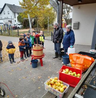Zum Ende der Erntesaison waren auch die Kinder der Gusenburger Kita unterwegs und sammelten mit ihren Eltern fleißig Äpfel auf den heimischen Streuobstwiesen ein. Ein besonderes Highlight war dann der Besuch bei Hermann-Josef Schuh und seiner Frau Mariette. Sie erklärten sehr anschaulich den Werdegang vom Apfel bis zum Apfelsaft. Dabei durften die Kinder natürlich in der Praxis direkt mitmachen: Zunächst wurde die Äpfel im Häcksler zerkleinert. Hierbei entstand „Apfelmatsche“. Diese kam dann in eine sogenannte Apfelpresse und wurde unter Druck so lange gepresst, bis der Saft in den dafür bereitgestellten Eimer lief. Der selbstgepresste Apfelsaft wurde sofort verkostet und schmeckte allen vorzüglich. Die Kita bedankt sich ganz herzlich bei der Familie Becker-Schuh.