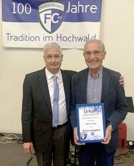 Vorsitzender Joachim Wellenberg ernannte Werner Bier (r.) zum Ehrenmitglied des FC Züsch-Neuhütten Damflos.