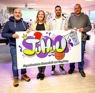 Der neue Name des Jugendzentrums, "JuHuU", steht für "Jugendzentrum Hermeskeil und Umgebung" und wurde durch die BesucherInnen des Jugendzentrums festgelegt. Das frische Emblem wurde nun digitalisiert, um vielseitig einsetzbar zu sein. Es wird nicht nur auf Briefköpfen und Schildern zu sehen sein, sondern auch als Stempel und weiteren Werbemitteln Verwendung finden. Die Stadtbürgermeisterin schließt sich der Begeisterung an und lobt nicht nur das gelungene Design, sondern dankt Mike Metzger auch für seine kreative Umsetzung.
