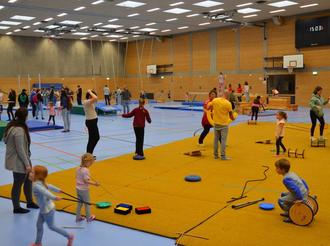 In der IGS Sporthalle war für die älteren Kinder ein toller und spannender Parcours aufgebaut. Sie konnten sich an verschiedene Stationen ausprobieren, wie zum Beispiel Klettern und Schwingen an den Seilen, Springen auf dem Trampolin, Akrobatik- und Zirkusgeräte ausprobieren, Umschwünge am Reck vollziehen und vieles mehr. Der Menschenkicker war der krönende Abschluss, hier hatten sogar die Mütter und Väter großen Spaß.
