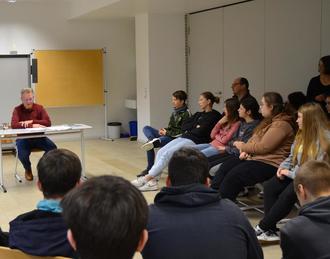 Manfred Köhl liest aus seinem Buch vor aufmerksamen Schüler/innen der Thalfanger Realschule plus.