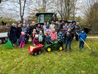 Die großen und kleinen Helfer und Helferinnen beim Herbstputz der Kita Gusenburg. Da darf der neue Dorfschlepper nicht fehlen.
