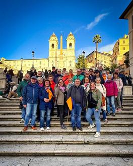 Die Pilgergruppe auf der Spanischen Treppe. Der Bezug zu Spanien resultiert übrigens aus der Tatsache, dass die Treppe von der Piazza Spagna aus nach oben führt. Der "Spanische Platz" wiederum verdankt seinen Namen der Spanischen Botschaft am Heiligen Stuhl, die heute immer noch hier ihren prächtigen Sitz hat.