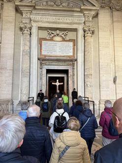 Nach dem Flug von Luxemburg und einer ersten Geduldsprobe am Gepäckband in Rom bezog die Gruppe ihr Quartier im „Casa Madre Speranza“, ein von Ordensschwestern geführtes Haus am Stadtrand mit guter Anbindung an den Hauptbahnhof Termini. Noch am Ankunftsabend ging es zur ersten der vier Hauptkirchen: Santa Maria Maggiore, der letzten Ruhestätte von Papst Franziskus. Hier durchschritt die Gruppe zum ersten Mal eine Heilige Pforte. Die üblicherweise zugemauerten Tore werden nur während eines Heiligen Jahres geöffnet. Das Durchschreiten gilt als Zeichen für einen geistlichen Neuanfang – eine Tradition, die an das alttestamentliche „Jubeljahr“ erinnert, in dem Schulden erlassen und Menschen von Lasten befreit wurden. Vor der Basilika stimmte die Gruppe gemeinsam „Stille Nacht“ an. Luisa Maurer verteilte im Anschluss jedem Pilger ein blau-orangefarbenes Tuch mit der Aufschrift „Pilger der Hoffnung“ – von nun an das Erkennungszeichen der Hochwälder Pilger.
