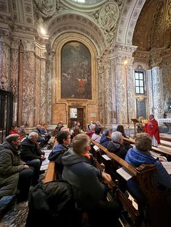 Auf dem Kapitol begegnete die Gruppe der kapitolinischen Wölfin, jener Bronzefigur, die Romulus und Remus säugend zeigt und an die Gründungslegende Roms erinnert. Von dort führte der Weg über das Forum Romanum bis zum Kolosseum, wo die gewaltigen Mauern von Spielen, Macht und auch von Leid und Tod in der Antike erzählen. Später führte Christian Heinz die Gruppe zur Lateranbasilika, der „Mutter und Haupt aller Kirchen des Erdkreises“, und zur Scala Santa, der Heiligen Treppe. Der Tradition nach soll Jesus auf dieser Treppe zu Pilatus hinaufgestiegen sein; heute steigen viele Pilger die Stufen auf Knien hinauf und verbinden jeden Schritt mit einem Gebet.