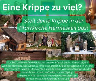 Vor genau 800 Jahren erfand der Patron unserer Hermeskeiler Pfarrei, der heilige Franziskus, im italienischen Greccio die Weihnachtskrippe. Er war so fasziniert davon, dass Gott Mensch wird – und zwar wehrlos, klein, auf Solidarität und Liebe angewiesen -, dass er das Weihnachtsevangelium darstellte. Die Weihnachtskrippen und Krippenspiele gehen auf das Weihnachtsfest 12023 in Greccio zurück. Zu diesem besonderen Anlass auch für unsere Pfarrei St. Franziskus bitten wir diejenigen, die eine Krippe zu viel haben oder ihre nicht mehr aufstellen, wenn sie wollen und können, diese in der Pfarrkirche St. Martinus aufzustellen. So entsteht eine (hoffentlich) vielfältige Krippenausstellung.