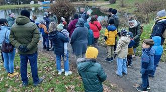Entlang der Storywalk-Stelen im Stadtpark lauschten rund 40 Kinder und Erwachsene – darunter auch Mitglieder des Leseclubs von Mehrgenerationenhaus und Stadtbücherei Hermeskeil – gespannt der Geschichte, bevor der Spaziergang einen stimmungsvollen Abschluss im Marienhaus Seniorenzentrum St. Klara fand.