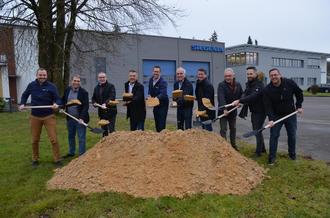 Symbolischer Spatenstich bei Siegenia mit VG-Bürgermeister Stefan Ding (3.v.li.), Werksleiter Uwe Ziewers (4.v.li.), Stadtbeigeordneter Bernhard Kronenberger (3.v.re.) sowie Architekt Simon Kolz (1.v.re.)