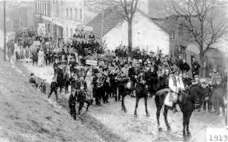Unser Archivfoto zeigt die Aufstellung zum ersten Hermeskeiler Karnevalszug 1913 in der unteren Bahnhofstraße (heute Trierer Straße) vor den damaligen Häusern Bäckerei Krautloher, Möbelhaus Schuh-Eiden und Metzgerei Goldberg, etwa 100 Meter oberhalb des heutigen Kreisels. (WIL-)