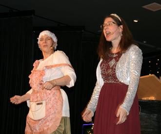 Allenfalls bei den Büttenrednern gibt es noch etwas Nachwuchssorgen. Deshalb eröffnete auch „Gastdozentin“ Lena Weber aus Hermeskeil den Reigen in der Bütt. Mit einer klassischen Rede in Reimform nahm sie sich die Parteienlandschaft und den Wahlkampf im Land vor. Das Publikum band sie wieder mit „Ergänzungsreimübungen“ ein. Während der vordere Teil des Saales die Vortragende als erste Rednerin fleißig unterstützte, musste Sitzungspräsident Weist den hinteren Teil des Saales leider bereits zu diesem frühen Zeitpunkt zu Ordnung und Aufmerksamkeit aufrufen. Den Abschluss des ersten Teils bildeten Astrid Weist und Nicole Bellert mit ihrer Premiere in der Bütt. Die beiden Ex-Prinzessinnen als Aschenputtel und Prinzessin verkleidet ließen in ihrem Vortrag in Reimform ihre Erlebnisse während ihrer Regentschaft noch einmal Revue passieren. Frei nach dem bekannten Märchen kehrte Aschenputtel das Negative und die Prinzessin das Positive nach vorne. Gesanglich gekonnt beschlossen sie die einzelnen Episoden mit einer dazu passenden Melodie.