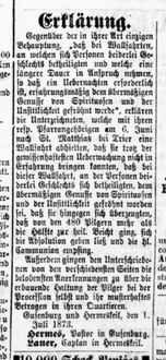 Gegenüber der in ihrer Art einzigen Behauptung, „daß bei Wallfahrten, an welchen sich Personen beiderlei Geschlechts betheiligten und welche eine längere Dauer in Anspruch nehmen, so daß ein Uebernachten erforderlich ist, erfahrungsmäßig dem übermäßigen Genusse von Spirituosen und der Unsittlichkeit gefröhnt werde“, erklären die Unterzeichneten, welche mit ihren resp. Pfarrangehörigen am 6. Juni nach St. Matthias bei Trier eine Wallfahrt abhielten, daß sie trotz der gewissenhaftesten Ueberwachung nicht in Erfahrung bringen konnten, daß bei dieser Wallfahrt, an der Personen beiderlei Geschlechts sich betheiligten, dem übermäßigen Genusse von Spirituosen und der Unsittlichkeit gefröhnt worden sei, daß sie hingegen sich überzeugten, daß von den 480 Pilgern mehr als die Hälfte zur heil. Beichte ging, sich die Absolution geben ließ und die hl. Communion empfing.