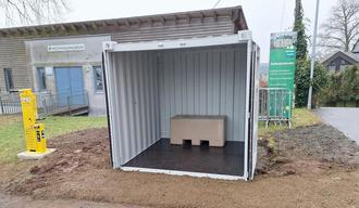 Nachdem am Neuen Markt die Holzhütten, die für die Busfahrgäste dort aufgestellt worden waren, vom einer Sturmböe weggeweht worden waren, hatte René Treitz, städtischer Beigeordneter für Bauangelegenheiten, angekündigt, für einen stabileren Ersatz zu sorgen. „Die Fahrgäste müssen eine Schutzmöglichkeit vor schlechter Witterung haben“, erklärte er. Nun wurden am Neuen Markt zwei kleine Seecontainer aufgebaut, in denen jeweils ein Betonstein platziert ist, der sie beschweren soll und zugleich als Sitzmöglichkeit dient. Zusammen mit dem Betonstein wiegt ein Container lt. Treitz etwa 1,8 Tonnen und damit mehr als doppelt so viel wie eine der Holzhütten, die nur 750 kg wogen. Die Container stehen auf einem planierten Schotterbett.