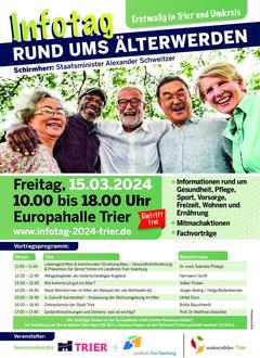 Am 15.03.2024 in der Europahalle Trier wird eine Art Messe stattfinden, in der mit umfangreichem Programm und zahlreichen Ausstellern Informationen "Rund um das Älter werden" vermittelt werden. Außerdem wird es einen Vortrag von Prof. Jäckel - verbunden mit einer Wanderausstellung "Was heißt schon alt?" am 1. März geben.