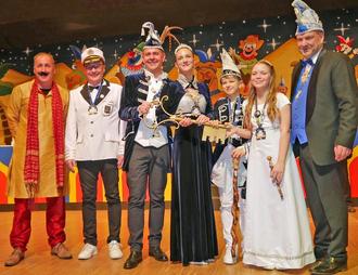 Auch der Nachwuchs in der Bütt, die 16-jährige Imke Nolden, wusste nicht nur mit ihrem Kostüm, sondern auch mit ihrem Vortrag zu glänzen: Mit „Endlich 16 - jetzt wird gefeiert!“ ließ sie die Höhen und Tiefen einer Party mit geladenen und ungeladenen Gästen Revue passieren. Ihr folgte das Prinzenpaar der Session, Prinzessin Anna II. und Prinz Dirk I., die sich in amüsanter Form vorstellten und den Ruck Zuck-Vorsitzenden überraschten, indem sie ihm für seinen unermüdlichen Einsatz mit einem Präsent dankten. Jörg Hartig gab den Dank weiter an eine fantastische Mannschaft, die er für ihr großes Engagement lobte. Die obligatorische Übergabe des Rathausschlüssels verband Stadtbürgermeister Christoph König ebenfalls mit einem großen Dank an den Ruck Zuck, der mit seinem professionellen Auftreten „ein Aushängeschild und ein Botschafter für Hermeskeil“ sei. Bürgermeister Stefan Ding schloss sich dem in einem kurzen Grußwort in Reimform an.