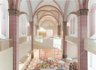 Neue Nutzungen sichern das Überleben von Bauwerken – und damit ihre Geschichte. In Hermeskeil wäre nicht zwingend eine „Abkehr“ von der ursprünglichen Idee der Kirche im Vordergrund sondern eine Erweiterung. Die Kirche kann weiterhin ein gemeinschaftlicher Ort bleiben und damit ihre ursprüngliche Rolle in zeitgemäßer Form fortführen. Das Kirchengebäude in Hermeskeil soll in seiner Substanz erhalten bleiben. Außer dem Sakristeianbau sei die Bausubstanz einschließlich Dachkonstruktion funktionstüchtig. Wo es notwendig ist, werden zusätzliche Fenster ergänzt, um die Räume heller zu gestalten und den neuen Nutzungen gerecht zu werden. Ein modernes, energieeffizientes Heizsystem sorgt künftig für zeitgemäßen Komfort. Der freie Raum ist so großzügig, dass er als Bürgersaal für die Stadt oder als Ort für die Kirchengemeinde genutzt werden kann. Bistro, Küche, Mehrzweckraum und Personalbereiche werden als zweigeschossiger Einbau in Holzbauweise realisiert. Diese Einbauten sind klar ablesbar, respektieren den Bestand und bleiben zugleich zurückhaltend. Der Altarbereich kann erhalten bleiben. Einige Flächen wären dem Kindergarten vorbehalten, die meisten Flächen aber könnten multifunktional genutzt werden. Die Gruppenräume des Kindergartens würden in einem strukturierten Neubautrakt entstehen, ebenfalls als Holzbau denkbar. Diese klare Organisation ermöglicht kurze Wege, gute Übersicht und eine personalsparende Nutzung. Der neue Haupteingang liege bewusst an der Schnittstelle zwischen Kirche und Neubau.